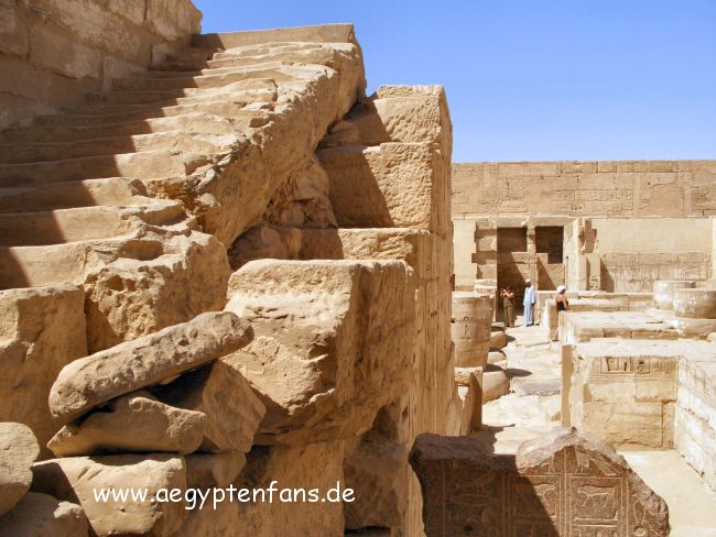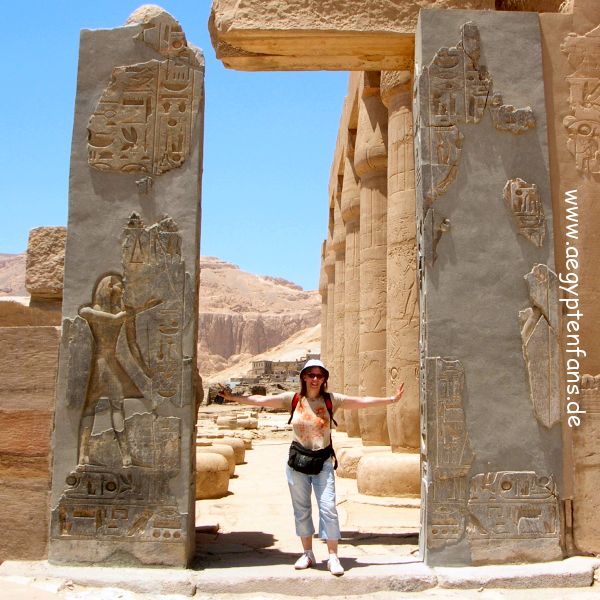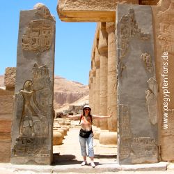 Das war gar nicht so einfach. Eine Treppe, die auf den Pylon rauf führte war mit einem dicken Stein versperrt. Also blieb uns gar nichts anderes übrig, als den Pylon von hinten zu besteigen. Und so kämpften wir uns über das aufgeschüttete Geröll steil nach oben. Belohnt wurden wir mit einem phantastischen Blick über das Ramesseum und über Theben-West. |
