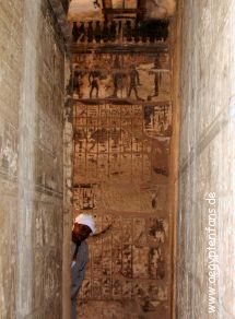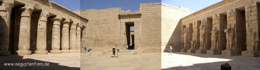 ![]() Der erste Hof des Tempels (Stümperhaft zusammengesetzt aus drei Fotos. ![]() Im ersten Hof geht es auf den Reliefs hauptsächlich um Krieg und den Helden Ramses III, der sowohl die Lybier als auch die Seevölker besiegt hat. |
