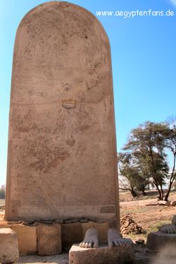 Wir beschlossen kurzerhand mal das Areal hinter den Kolossen zu besichtigen. Dort wo früher einmal der Totentempel von Amenophis II gestanden hat wird jetzt fleißig ausgegraben. Man kann dort nicht viel sehen, weil das meiste mit Planen abgedeckt ist um es vor den Blicken der neugierigen Touris zu schützen. Und eigentllich ist dort auch das Betreten verboten, was uns auch ein von weitem rufender Ägypter klar machen wollte. Da es aber keine Verbotsschilder oder Absperrungen gab, sind wir gemütlich Meter für Meter weitergezogen. | ![]() Stele und Füße |