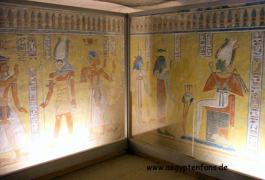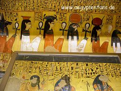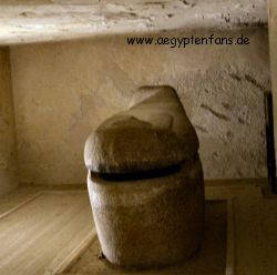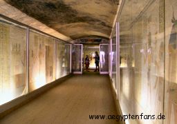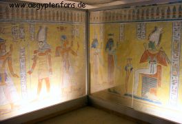 ![]() Im Grab befindet sich in der hintersten, unbemalten Kammer auch ein Sarkophag. Ebenso eine Glasvitrine mit einem mumifizierten menschlichen Fötus. Dieser wurde eigentlich im Tal der Könige gefunden. |