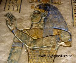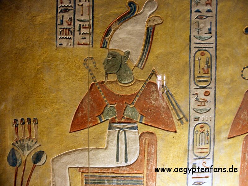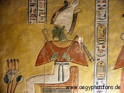 ![]() Auf den Reliefs werden die Figuren oft mit grüner Haut dargestellt. Das bedeutet, diese sind tot. Grün war bei den alten Ägypter die Farbe der neuen Vegetation und der Fruchtbarkeit, und es stand symbolisch für die Überwindung des Todes. |