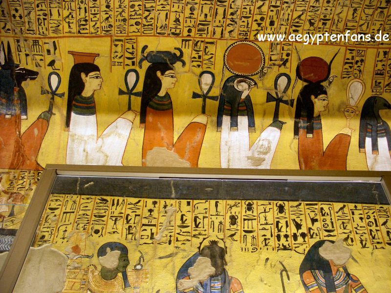 ![]() Nicht alle Fotos gelingen so gut wie dieses, denn die Malereien im Grab werden durch große spiegelnde Glasscheiben vor Touristen, die immer alles anfassen müssen (die gibt es leider immer wieder) geschützt. Bild vergrößern |