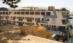 Zum Abschluß gabs noch für unseren Fahrer und uns einen Tee im Hapy Habu Restaurant. Wieder war er weit über 40 Grad und wir waren froh, dass wir mit dem Auto zurückfahren konnten. Kaum im Hotel angelangt, bekamen wir von einem unserer früheren Reiseführer Zaki per SMS die Meldung: "Ich bin gleich in Luxor. Bin auf der `Nile Supreme´, kommt Ihr vorbei?" - Na gut, wir also flott unter die Dusche und dann noch mal schnell zum Supermarkt um die Ecke. Dort hing auch ein Karten-Telefon und mit einer frisch erstandenen Telefonkarte rief Nico mal eben auf der Nile Supreme an. "Wo bist Du?" - "Ich fahre gerade am Luxor-Tempel vorbei." - Na so ein Zufall. Also genau da auf dem Nil, wo wir gerade standen. Er stand auf Deck und winkte heftig. Wir natürlich auch. Das Schiff hupte laut, als es vorbei fuhr. |