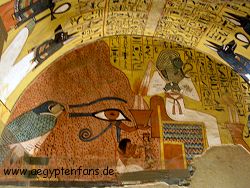 ![]() Das Grab des Peschedu hat unglaublich gut erhaltene Farben und sollte unbedingt besichtigt werden. Ein besonderer Hingucker ist z.B. dieser Rundbogen mit dem großen Horusauge. |