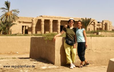 Unser Fahrer brachte uns danach zum Tempel von Sethos I. Wieder wollte uns der Tempelwächter führen, doch "We need no guide" scheint einer der wenigen Sätze zu sein, die wirklich unmißverständlich sind. Komischerweise klappte es damit regelmäßig in Ruhe gelassen zu werden. Oder lag es vielleicht doch an der Hitze? Bei der Bewertung des Tempels waren wir uns mal wieder einig. Im Gegensatz zu allen anderen Tempeln in Luxor ist der von Sethos I der langweiligste. Daher wurden diesmal weniger Fotos von Reliefs gemacht, dafür aber jede Menge gestellte Fotos mit Selbstauslöser. |