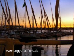 Wenn bei dieser Reise schon ausnahmsweise keine Nilkreuzfahrt dabei war, so kamen wir also trotzdem auf ein Nilschiff. Wir saßen ein Stündchen im Salon bei Tee und Kuchen bis wir dann schließlich mit Zaki und noch einem Kollegen zum Basar fuhren. In Luxor war ein höllischer Verkehr aufgrund der zahlreichen Baustellen. Und nach typischer ägyptischer Manier gab es ein überlautes Hupkonzert. Doch irgendwann erreichten wir unser Ziel. Bei Tee, Cola und natürlich einer Wasserpfeife wurde es langsam später. Und als wir schließlich mit der Einheimischen-Fähre zurück zum Hotel fuhren ging auch schon die Sonne unter. |