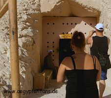 ![]() Hier geht es in das Grab von Teti. Manche vermuten sie sei die Frau von Ramses III gewesen. Man ist sich da aber noch nicht ganz sicher. Im Grab haben wir keine Fotos machen können. |
